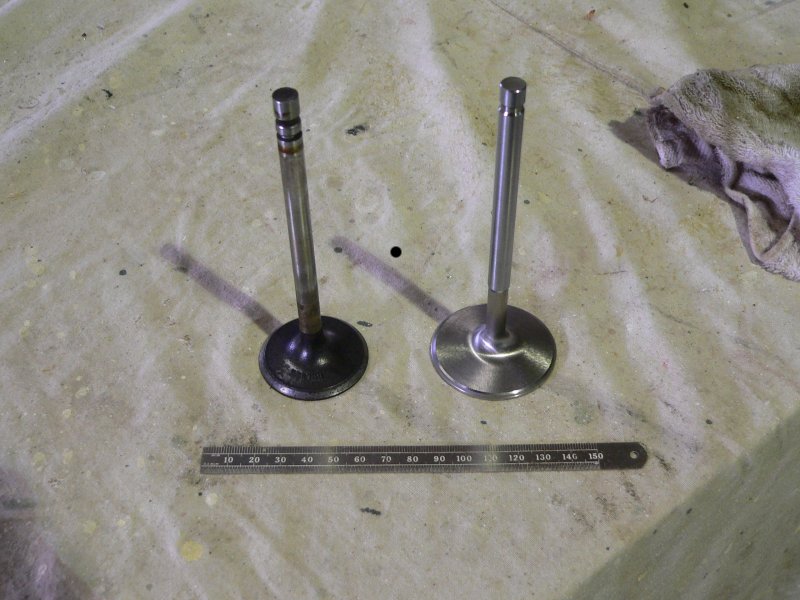 March 2006 - The cylinder heads are back from Cylinder Head Services - www.heads.co.nz. Here's a picture of the old inlet valve compared to the new larger ones. Their up from 1.75" to 2.02". That's an increase from approx. 2.41 square inches to 3.20 square inches, or around 1/3 increase in valve area - oh yeah!