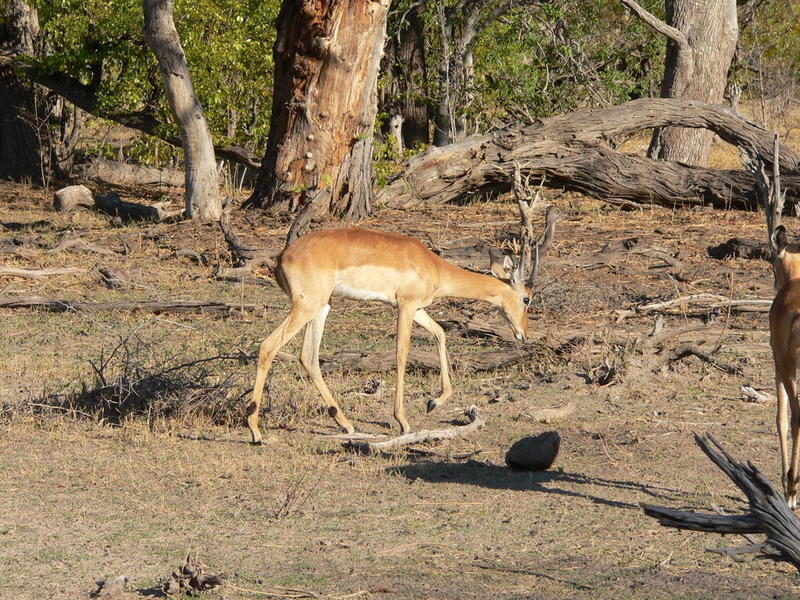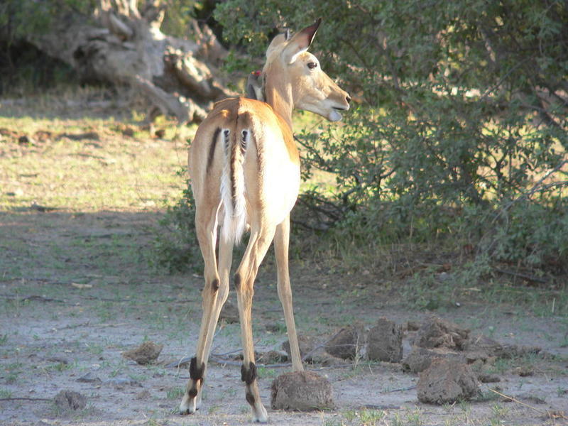 Female impala with oxpecker on board. Note the tufts of hair covering scent glands above the hooves of the hind legs.