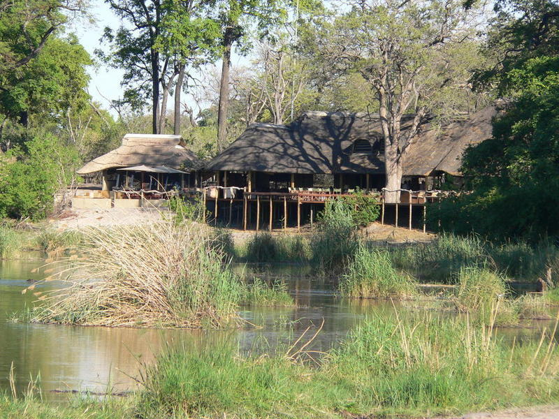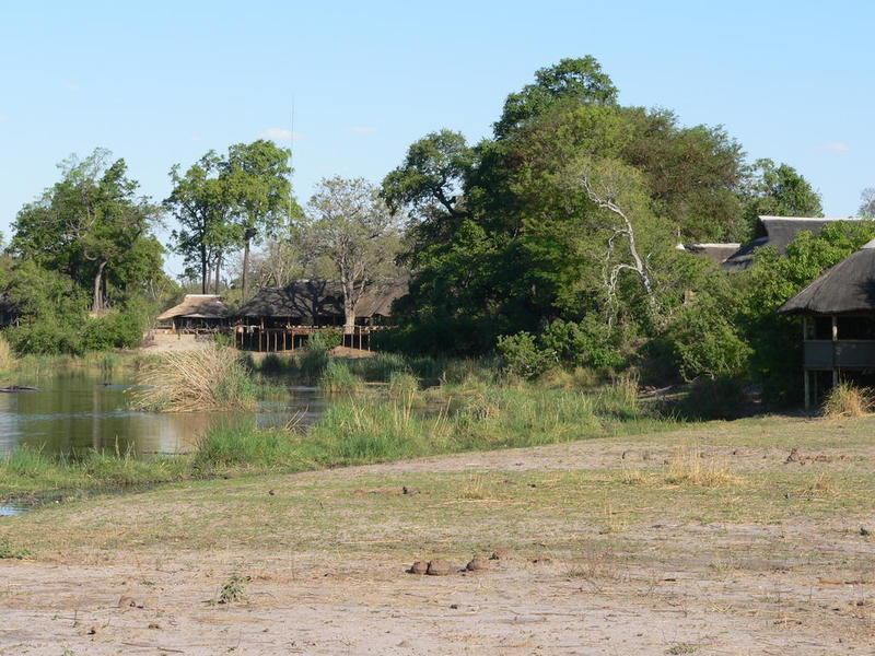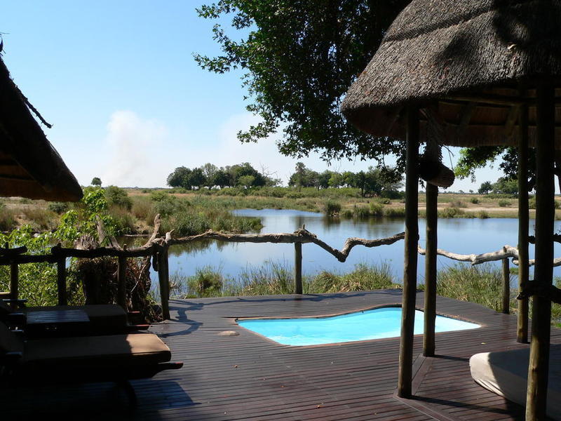 A close up of the noisy neighbours, hippo's, across the river.The deck with loungers to the left, outside bed to the right and plunge pool - lovely and cool. The wooden deck is about 3,000 degrees Centigrade in the early afternoon sun.